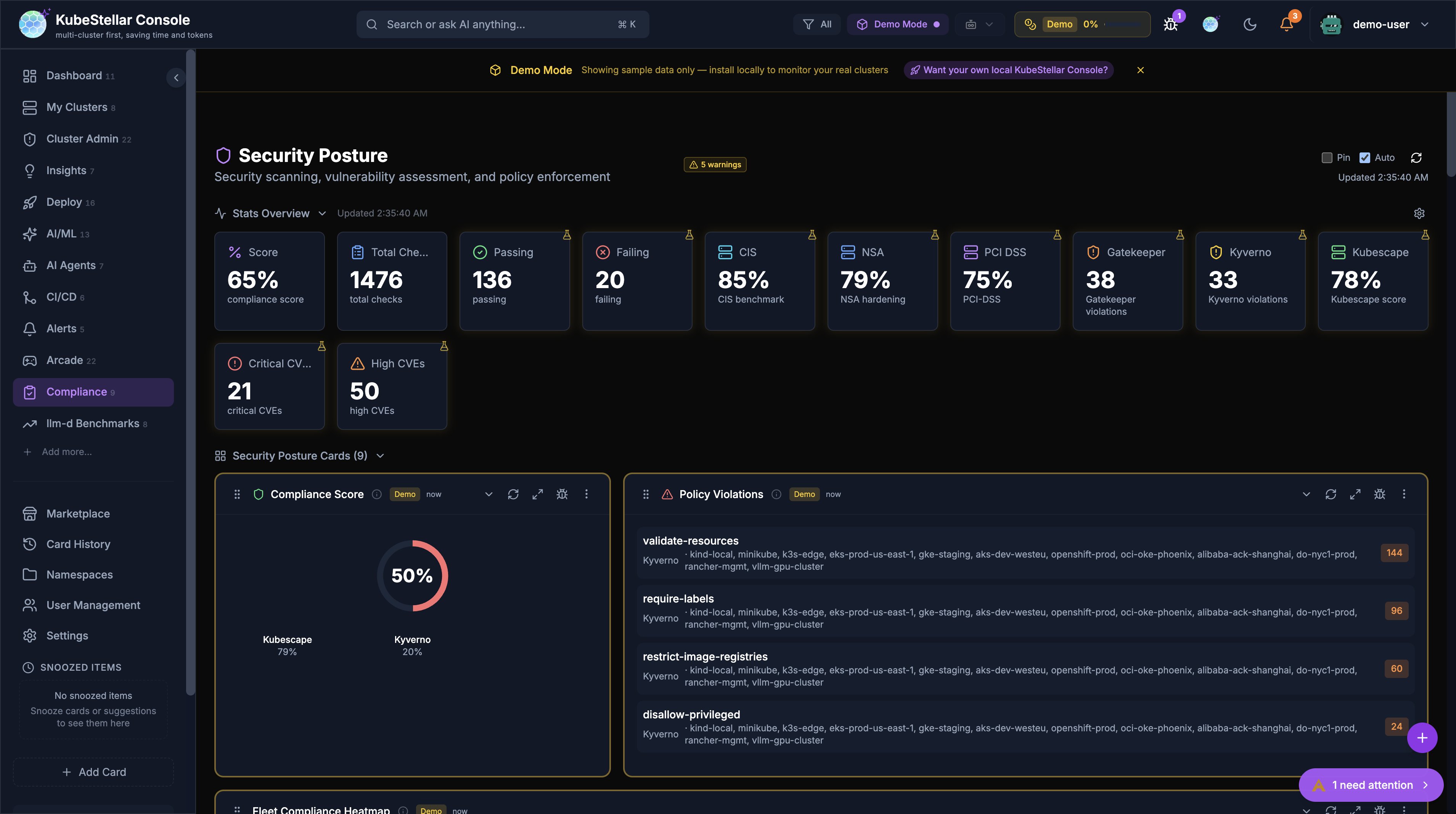 - Compliance Score: Overall security score across all clusters (e.g., 78%)