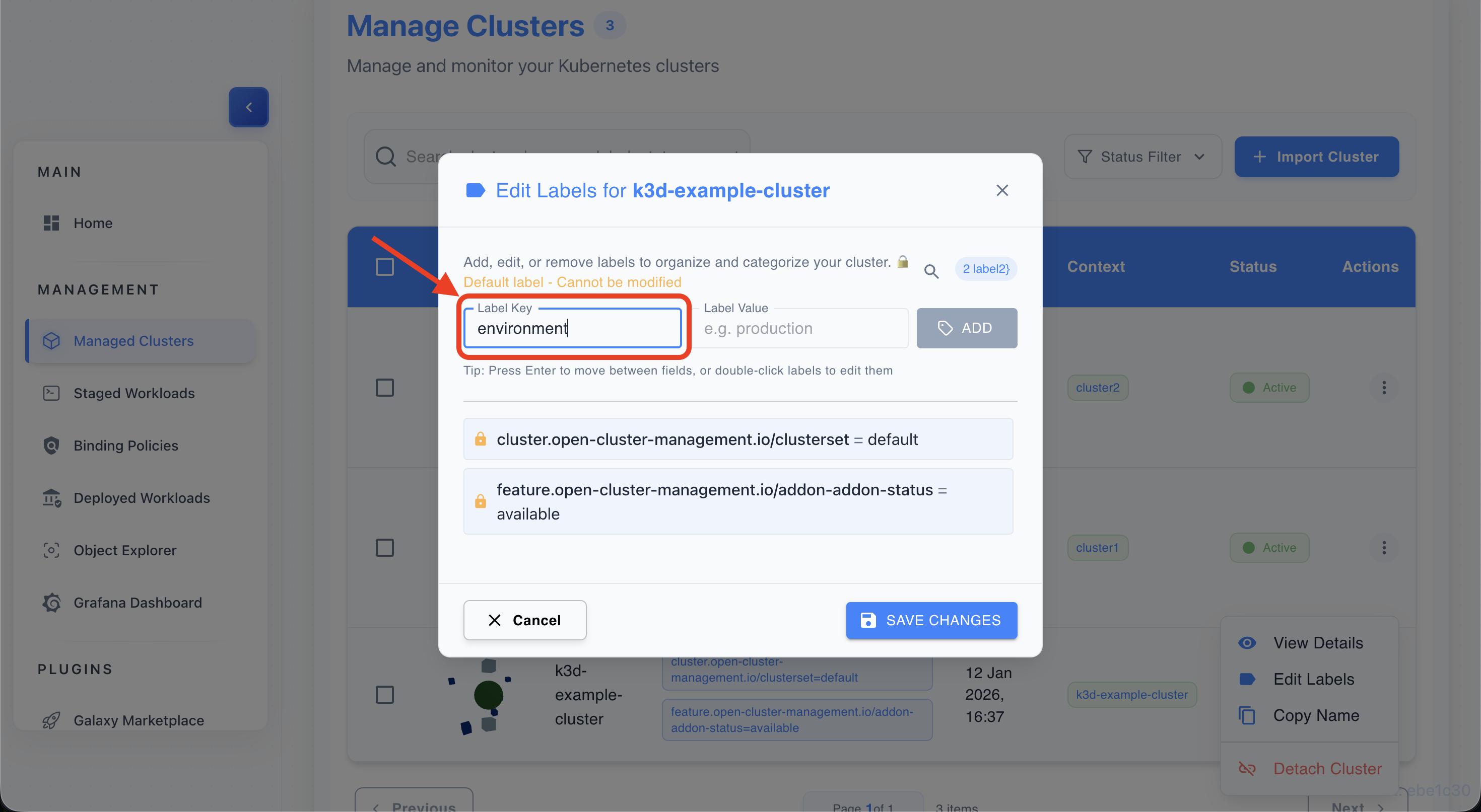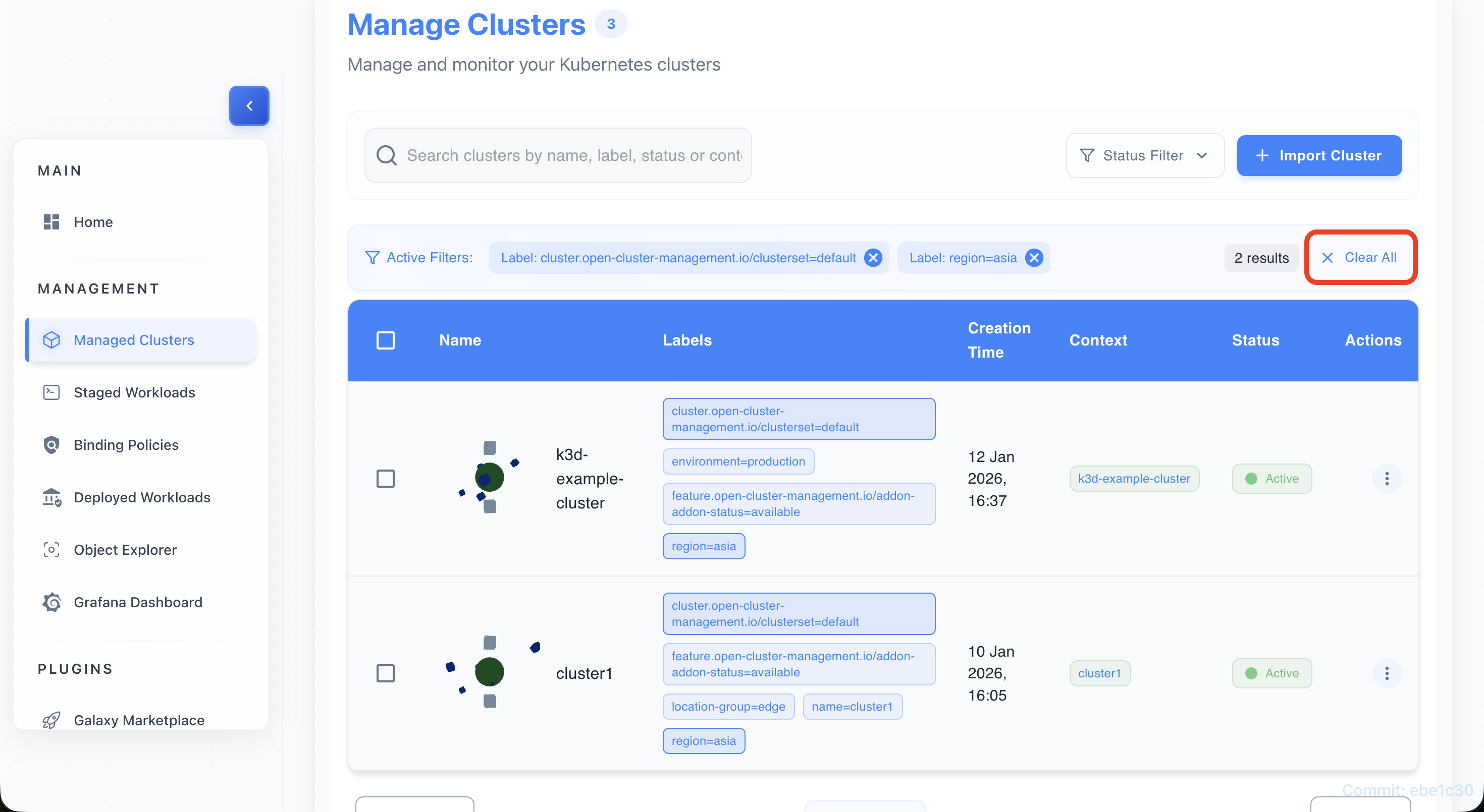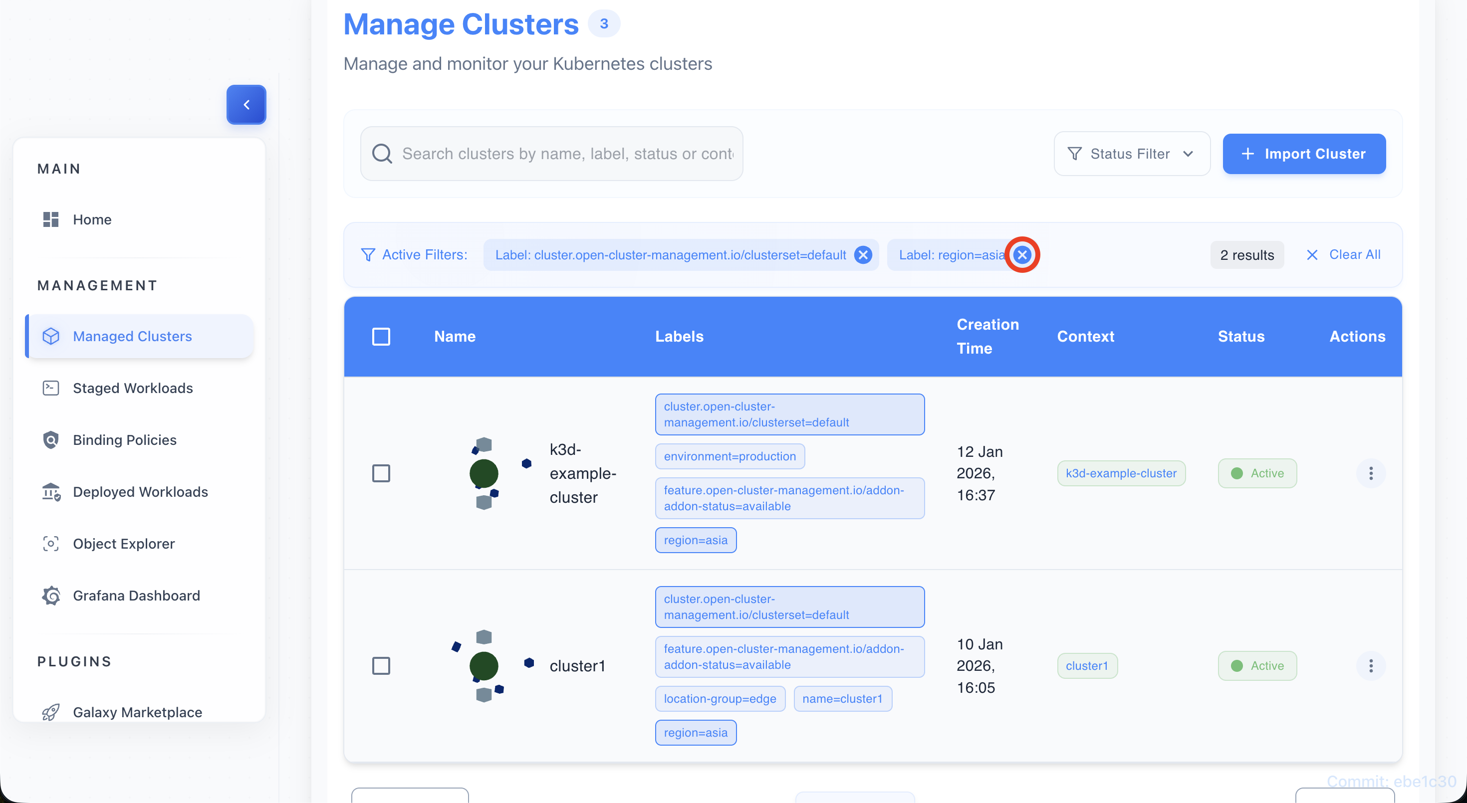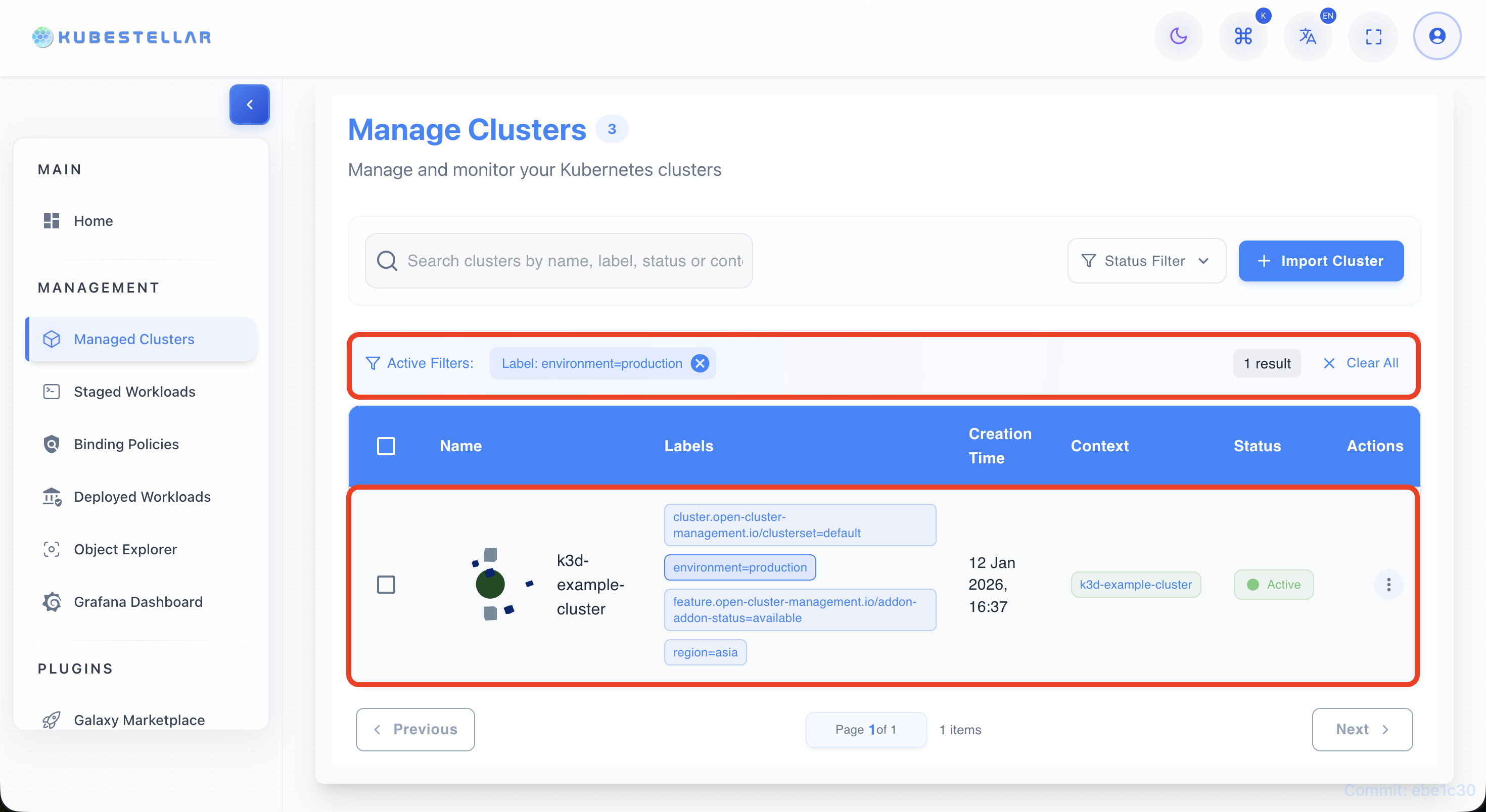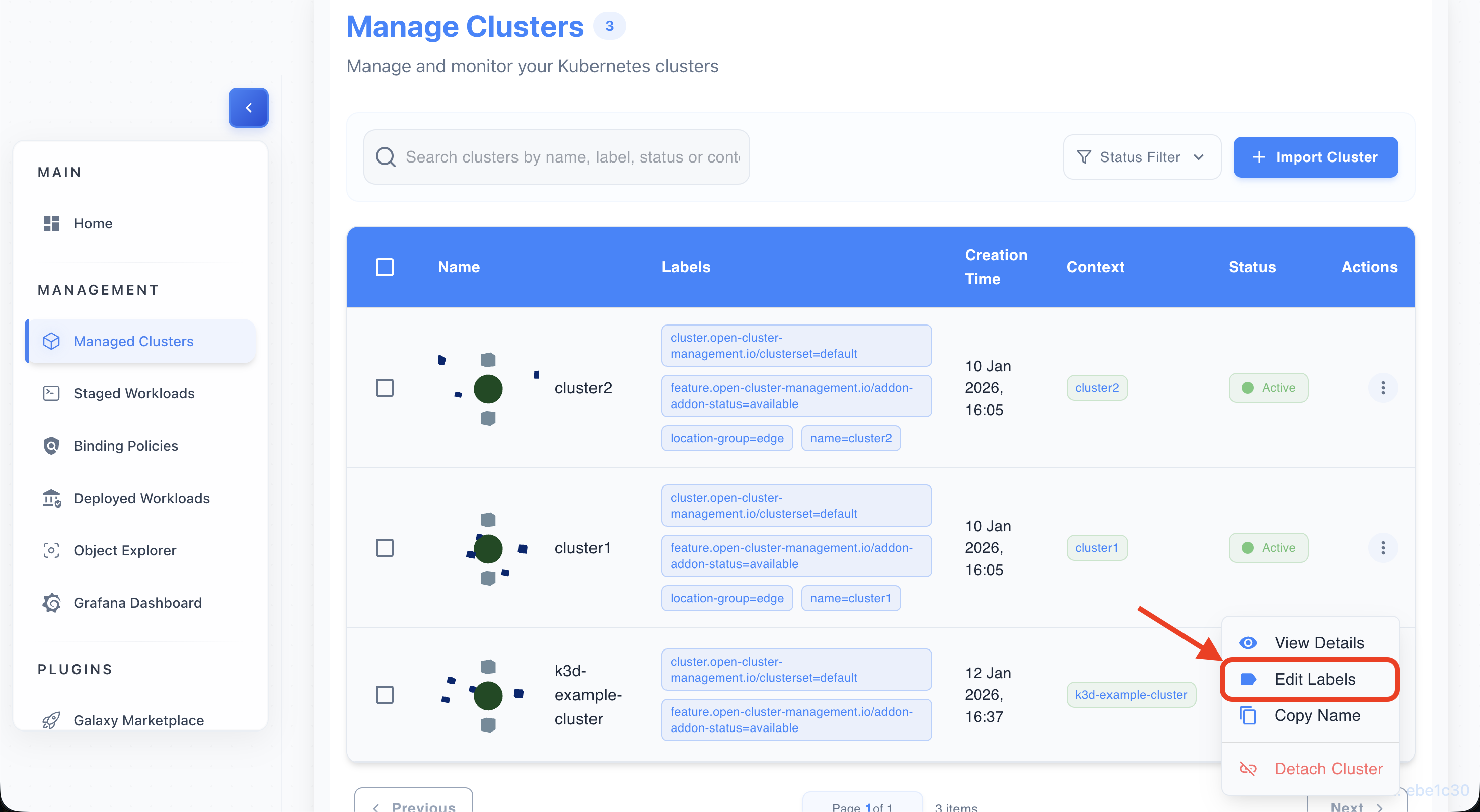 - Architecture: ITS aggregates cluster metadata, status, and labels from the KubeStellar backend. It presents search, filters, and actions to manage clusters and labels.