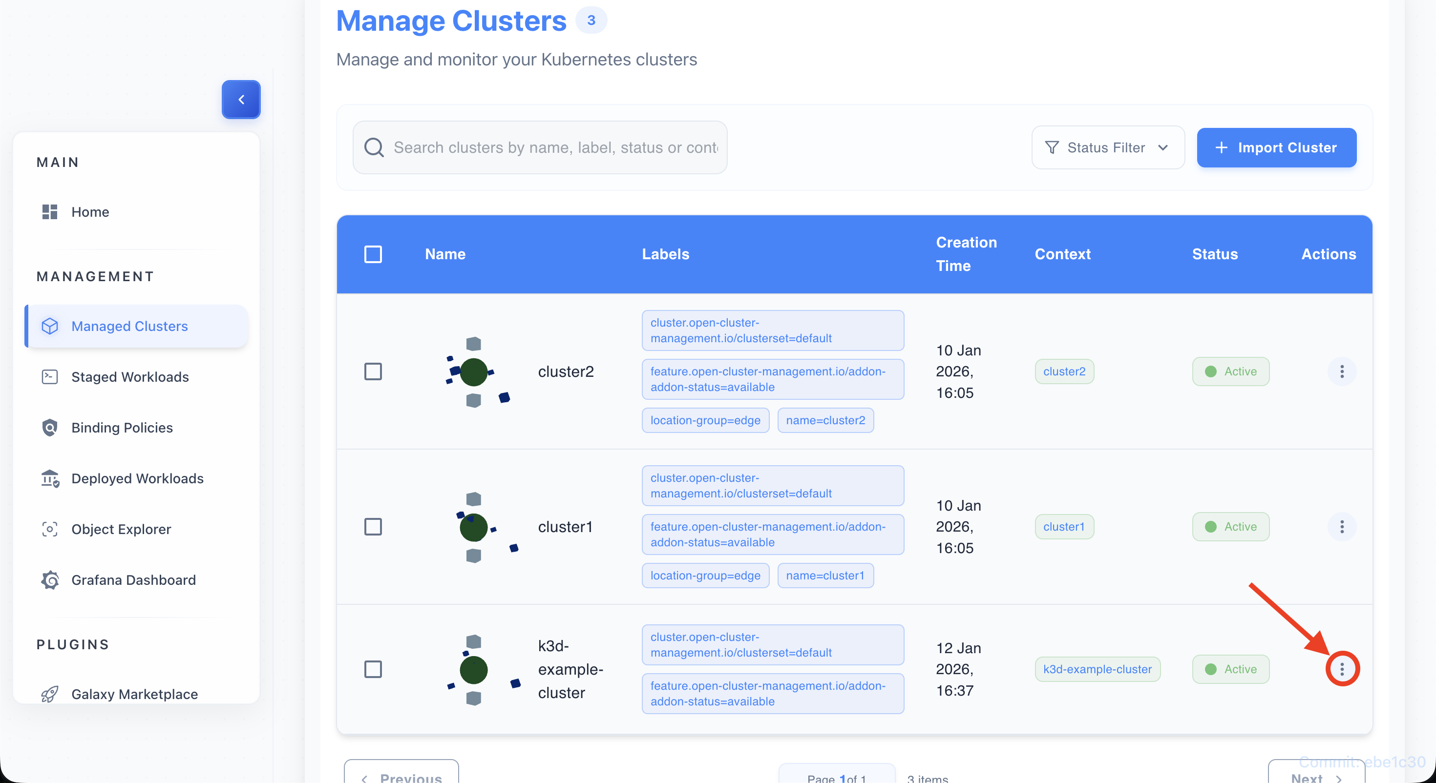 - Open the KubeStellar dashboard and select “Managed Clusters” from the main menu.